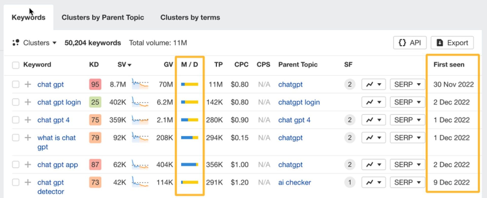 「初回確認日」列には、分析対象のキーワードがAhrefsによって最初に発見し、インデックスに追加した日付が表示されます。