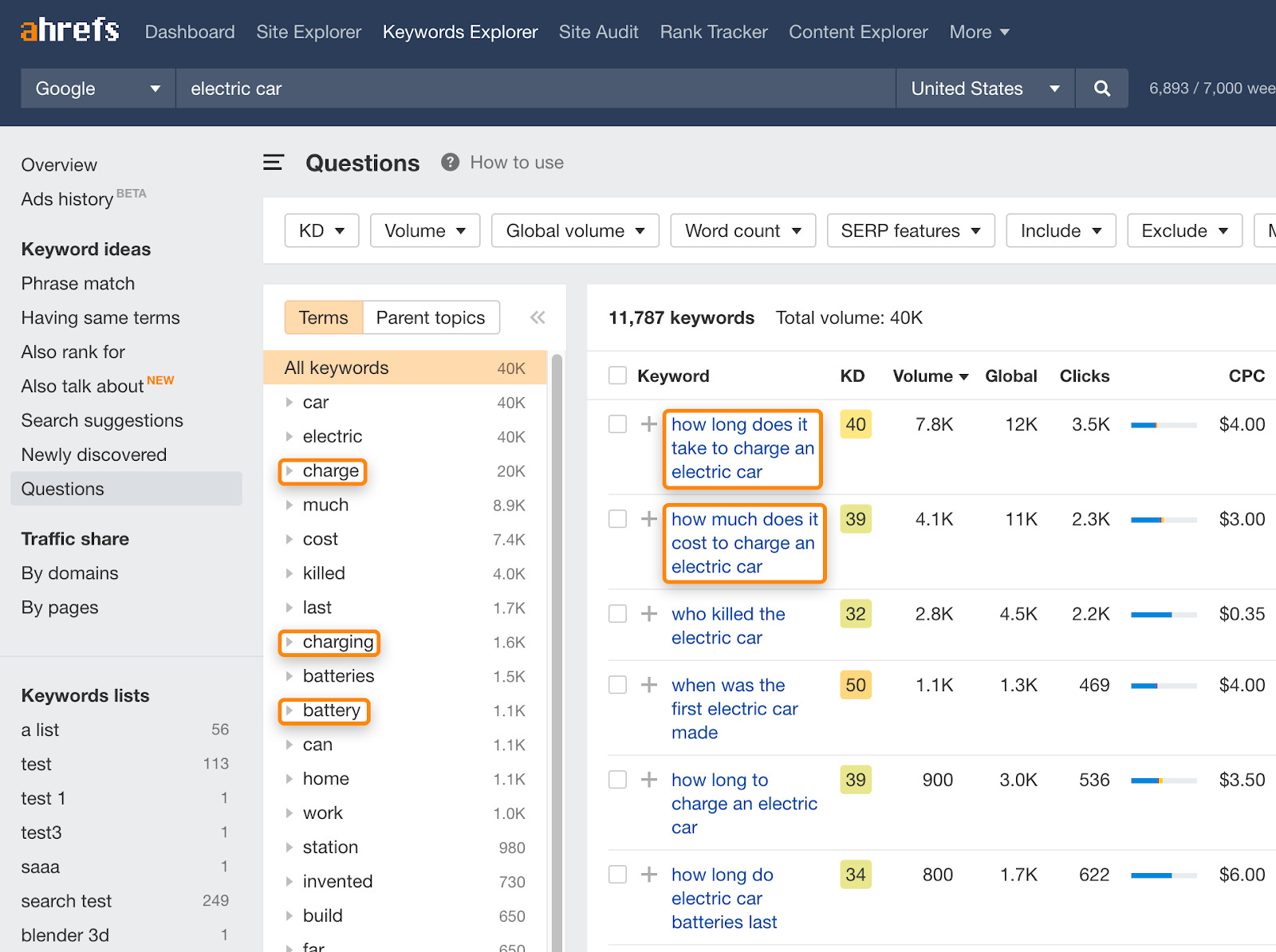 私はAhrefsのキーワードエクスプローラーを開き、”electric cars(電気自動車)”と入力し、Questionsレポートで人々が何を検索しているかを調べました。これにより、電気自動車の所有者が抱えている問題(そして潜在的な所有者が心配している問題)について知ることができました。あなたの業界でも、同様の調査を簡単に行うことができます。