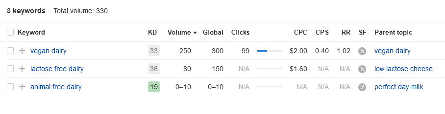 これで、何かが見えてきました。人々は「ヴィーガン・フリー(ヴィーガン向け ※この例では、ヴィーガン向けの乳製品代替品)」と「ラクトース・フリー乳製品」をより頻繁に検索しています。同じ単語ではありませんが、密接に関連しています。しかし、検索ボリュームの違いを見てください。